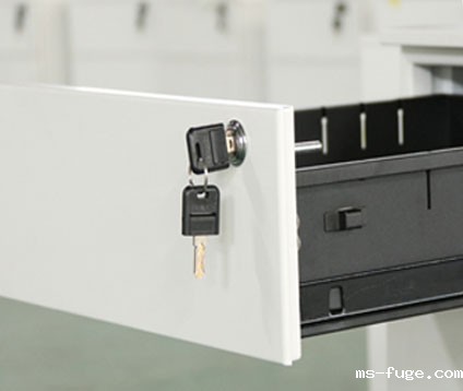 Conventional configuration: side handle, two small and one big draw, with a pen box, two plug boards, three sets of 16 inch three section slide rail, conventional lock, and five movable wheels